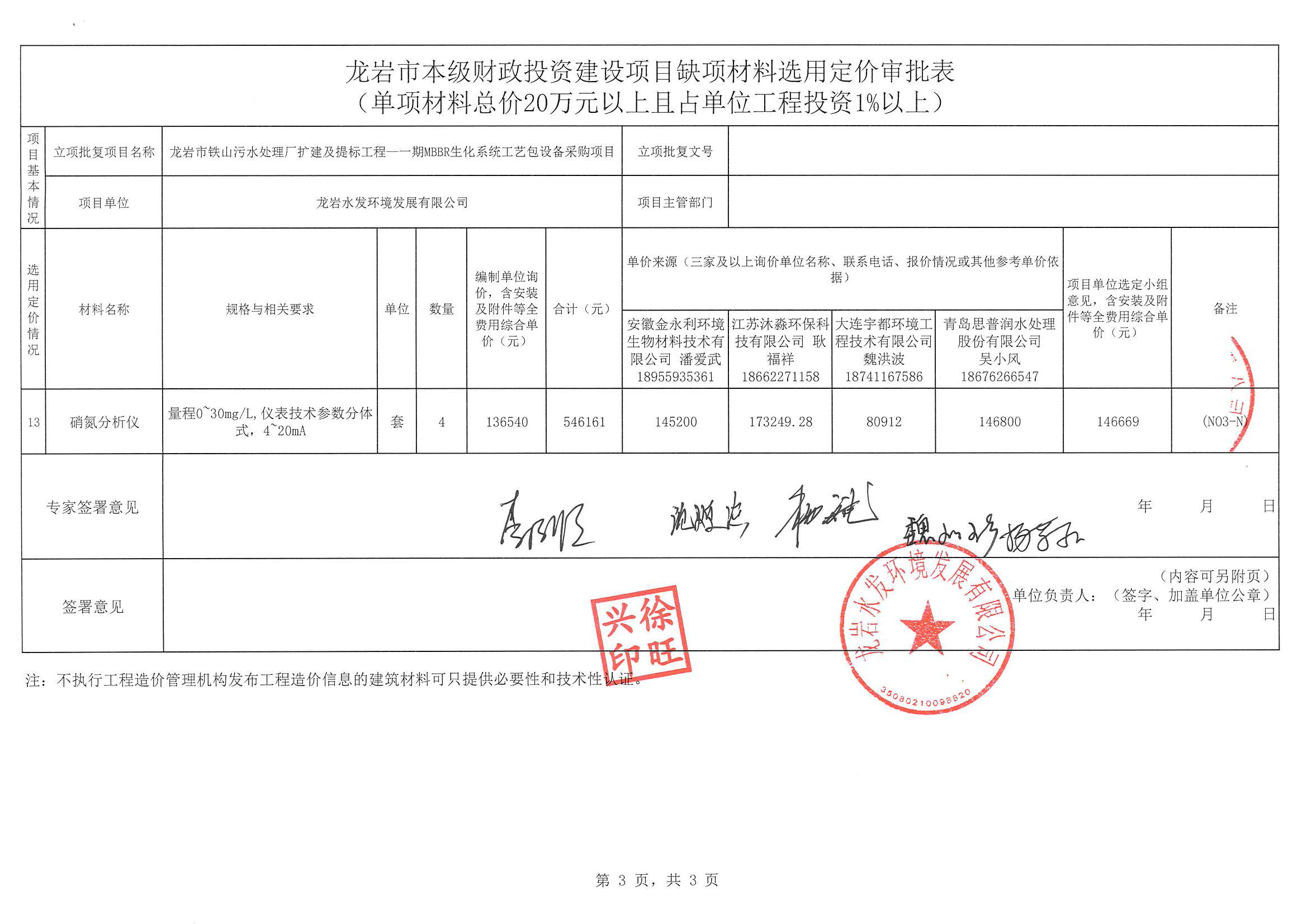 根據《龍巖市財政局 龍巖市發展和改革委員會 龍巖市住房和城鄉建設局關于深化龍巖市本級財政投資評審改革的實施意見》(龍財建〔2019〕62號)文件要求,現將龍巖市鐵山污水處理廠擴建及提標改造工程-一期MBBR生化系統工藝包設備采購項目缺項材料補充定價公示(公示期:2024年1月26日-2024年2月2日),具體內容詳見附件。