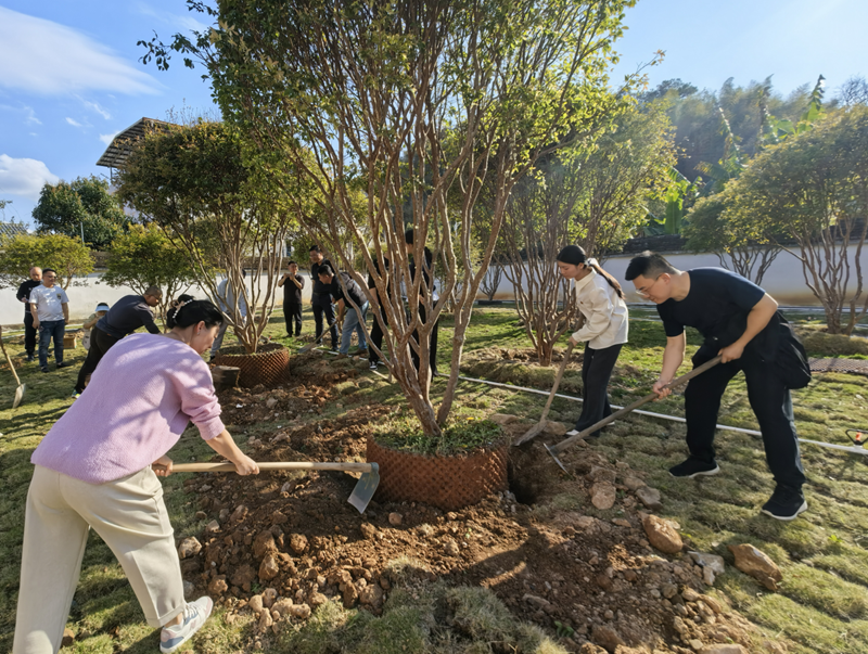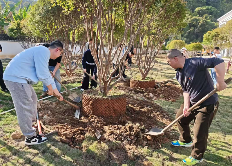 活動現場,大家按照分組,領取植樹工具和樹苗,在專業人員的指導下,迅速投入到植樹勞動中。黨員同志們揮鍬挖坑、扶樹培土、提桶澆水,每一道工序都一絲不茍,有效提高團隊協作意識和環保責任感。經過一番辛勤努力,一棵棵樹苗在鐵山污水處理廠的廠區內穩穩扎根,為這片土地增添了勃勃生機。